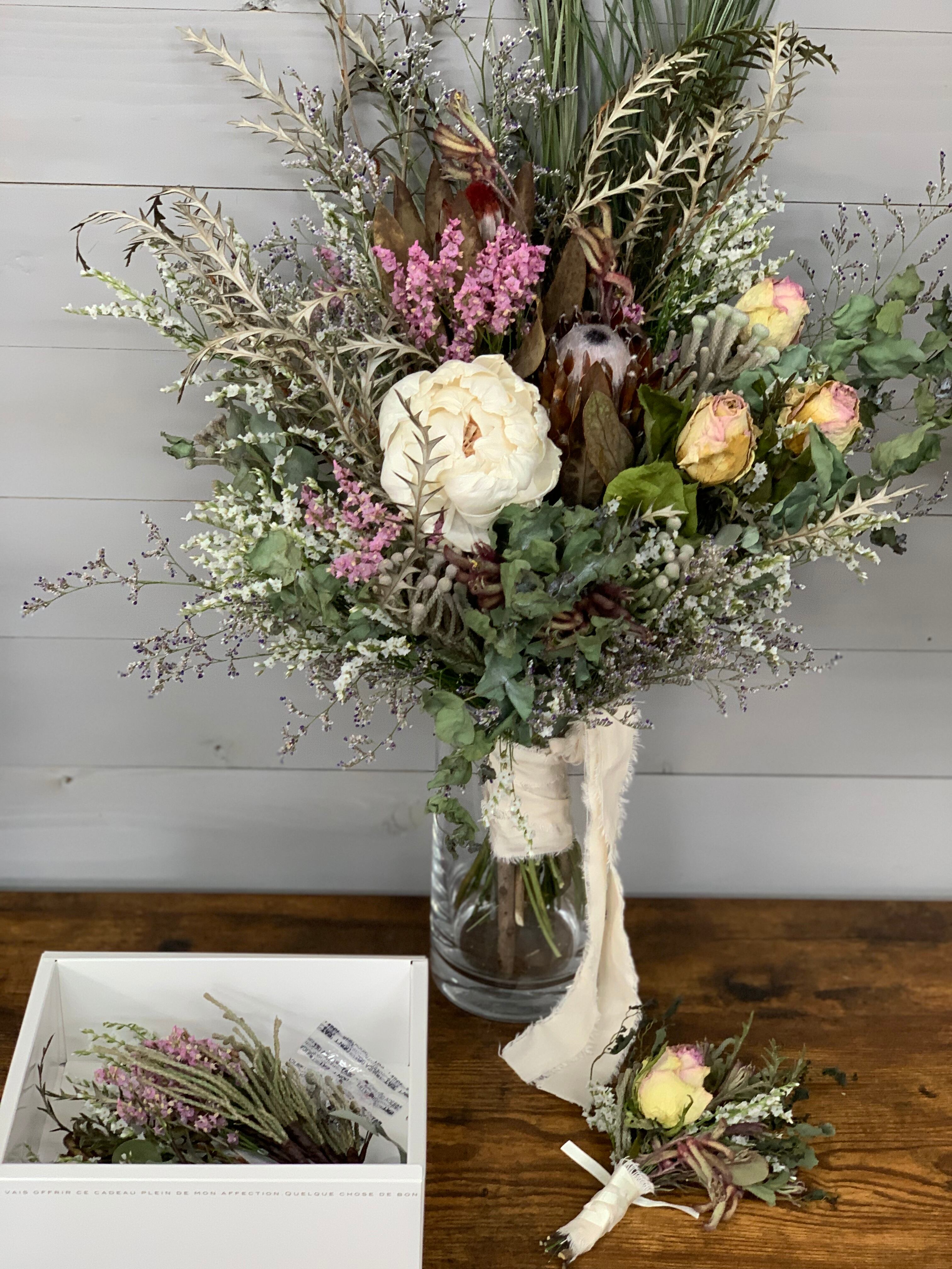 ドライフラワーとプリザーブドフラワーを使用したウエディングブーケになります。